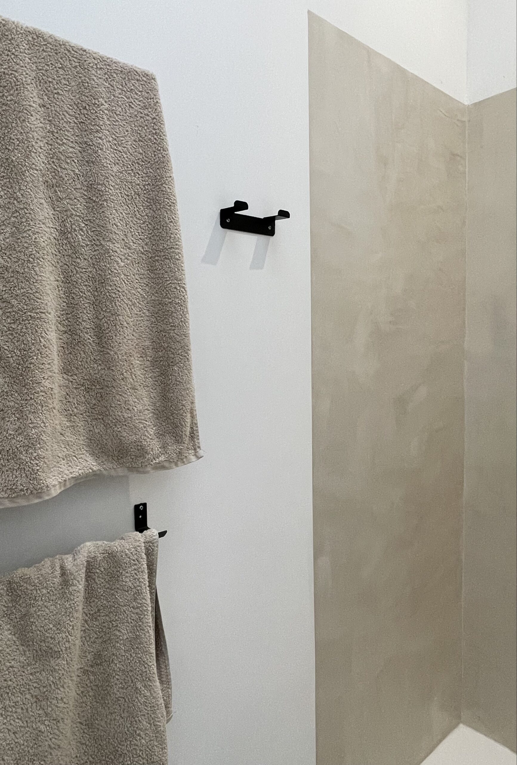 Enduit chaux et sable en 0-2 (1 cm), car l’envie est de garder une structure pas trop lisse. Sur fibre de bois et fermacell, avec patine blanche sur le blanc, et différents bleus sur un enduit bleu.