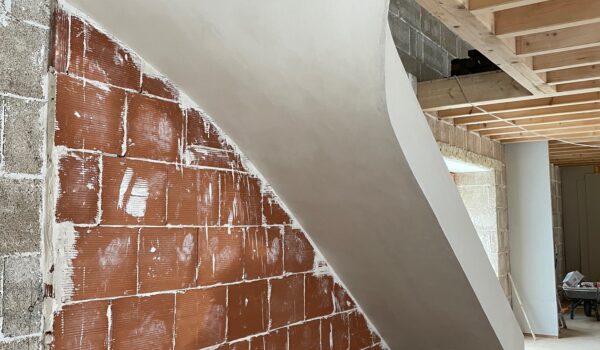 Des briques de chanvre posées avec soin, dans une grande longère entièrement rénovée, au coeur de cet endroit magique qu’est le Golfe du Morbihan. Que du bonheur sur ce chantier en chanvre de finition, angles serrés et le tout bien blanc.