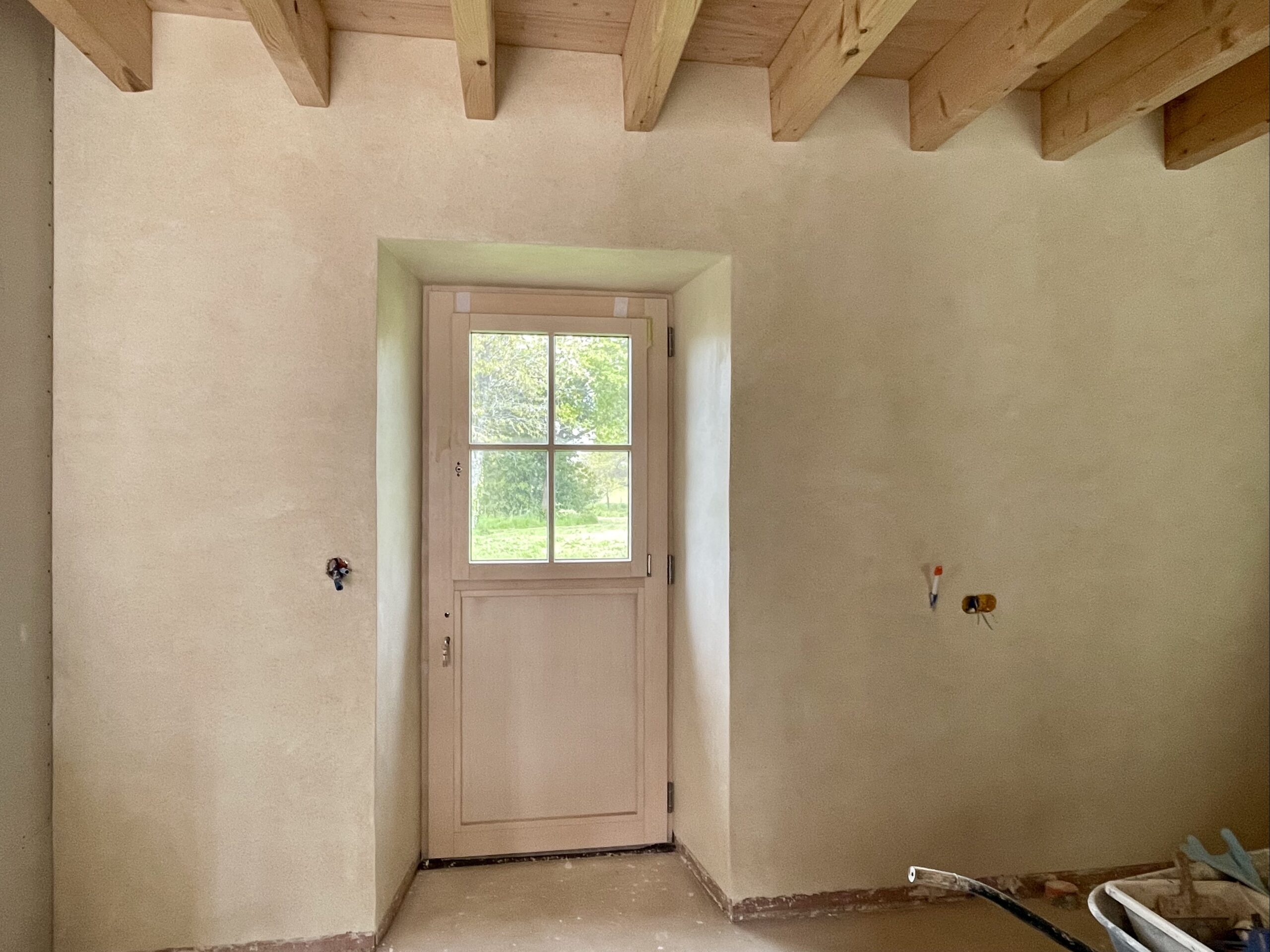 Un chantier d’hiver, au bord de la mer. En deux passes pour une épaisseur moyenne de 3 cm. La capacité de transformation des murs en très peu de temps est ce qui me fascine avec cet enduit chaux et chanvre. À noter, le chanvre permet aussi de bloquer les remontées de suie. Plus pratique que la méthode de la bouse de vache !